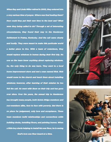 When Ray and Linda Miller retired in 2003, they entered into a very serious time of prayer. Where was God leading them? How could they put their new time to the best use? What were they being called to do? Through a set of interesting circumstances, they found their way to the Henderson Settlement in Frakes, Kentucky. And the call came clearly and loudly. They were meant to make this particular world a better place to live. With a team of volunteers, they would replace windows in homes during their first trip. No one on the team knew anything about replacing windows. So, the only thing to do was learn. They went to a local home improvement store and met a man named Rick. Rick would come to the church and teach them about installing windows; however, after learning of their mission he too felt the call. He went with them on their trip and has gone ever since. Over the years, the annual trip to Henderson has brought many people, both Scioto Ridge members and non-members alike, face to face with poverty. But there is no place for judgement, only love and acceptance. These team members build relationships and connections while building decks, installing floors, and painting homes. When a little boy starts helping to install his new floor, he is seeing God’s love one floor board at a time.