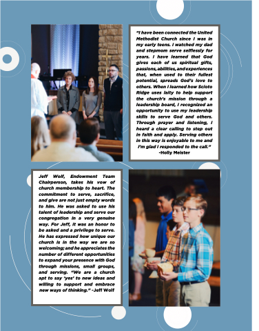 “I have been connected the United Methodist Church since I was in my early teens. I watched my dad and stepmom serve selflessly for years. I have learned that God gives each of us spiritual gifts, passions, abilities, and experiences that, when used to their fullest potential, spreads God’s love to others. When I learned how Scioto Ridge uses laity to help support the church’s mission through a leadership board, I recognized an opportunity to use my leadership skills to serve God and others. Through prayer and listening, I heard a clear calling to step out in faith and apply. Serving others in this way is enjoyable to me and I’m glad I responded to the call.” -Holly Meister