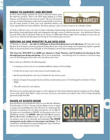 Jesus said that we are most like him when we serve like him (Matthew 25:32-40; John 13:12-17). Serving at Scioto Ridge can be as simple as seeing a need and filling that need. However, we understand that sometimes recognizing your own gifts and passions can be difficult. We invite you to participate in SHAPE. God has given each of us a SHAPE for ministry. Our SHAPE—Spiritual Gifts, Heart’s passion, Abilities, Personality, and Experiences—gives us a unique way to see our primary ways to serve internally and missionally. The SHAPE assessment can be taken at www.srumc.org/shape. Then, email Pastor Todd Richards at pastortodd@srumc.org to schedule a one-on-one visit to dig into your results.