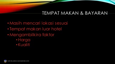 TEMPAT MAKAN & BAYARAN •Masih mencari lokasi sesuai •Tempat makan luar hotel •Mengambilkira faktor • Harga • Kualiti HARI KELUARGA SMK BANTURA 2018
