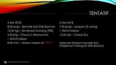 12.00 tgh – Ke tempat bowling (TER) • Aktiviti bebas