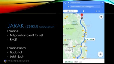 JARAK (334KM) GOOGLE MAP Laluan LPT - Tol gambang exit tol ajil - RM21 Laluan Pantai - Tiada tol - Lebih jauh HARI KELUARGA SMK BANTURA 2018