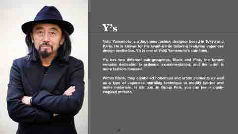 Yohji Yamamoto is a Japanese fashion designer based in Tokyo and Paris. He is known for his avant-garde tailoring featuring Japanese design aesthetics. Y’s is one of Yohji Yamamoto’s sub-lines.