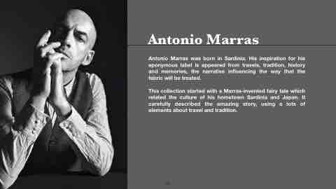 Antonio Marras was born in Sardinia. His inspiration for his eponymous label is appeared from travels, tradition, history and memories, the narrative influencing the way that the fabric will be treated.