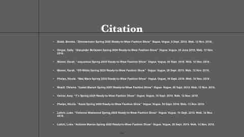 Mower, Sarah. “Jaquemus Spring 2020 Ready-to-Wear Fashion Show” Vogue. Vogue, 30 Sept. 2019. Web. 12 Nov. 2019. Mower, Sarah. “Off-White Spring 2020 Ready-to-Wear Fashion Show” Vogue. Vogue, 26 Sept. 2019. Web. 12 Nov. 2019. Phelps, Nicole. “Max Mara Spring 2020 Ready-to-Wear Fashion Show” Vogue. Vogue, 19 Sept. 2019. Web. 12 Nov. 2019. Nnadi, Chioma. “Isabel Marant Spring 2020 Ready-to-Wear Fashion Show” Vogue. Vogue, 26 Sept. 2019. Web. 12 Nov. 2019. Verner, Amy. “Y’s Spring 2020 Ready-to-Wear Fashion Show” Vogue. Vogue, 18 Sept. 2019. Web. 12 Nov. 2019.