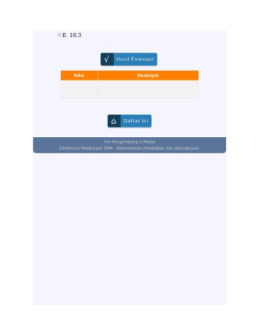 E. 10,3 √ √ Hasil Evaluasi Hasil Evaluasi Nilai Deskripsi ⌂ ⌂ Daftar Isi Daftar Isi Tim Pengembang e-Modul Direktorat Pembinaan SMA - Kementerian Pendidikan dan Kebudayaan