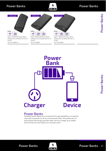 Portable Power Banks are comprised of a special battery in a special case with a special circuit to control power flow. They allow you to store electrical energy and then later use it to charge up a mobile device when you are away from a power point.