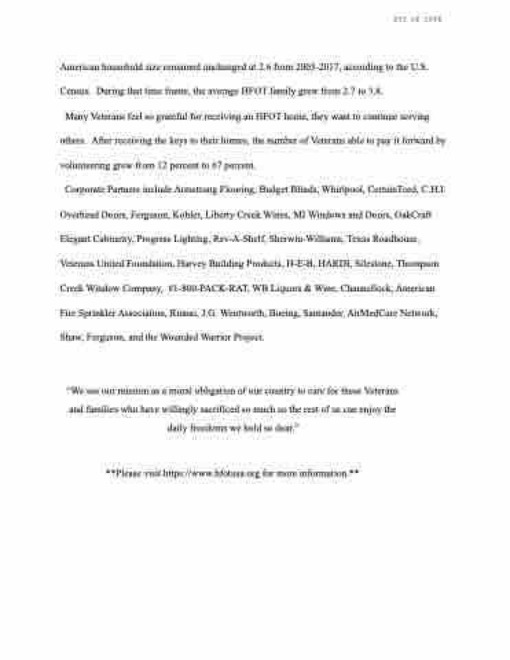 Corporate Partners include Armstrong Flooring, Budget Blinds, Whirlpool, CertainTeed, C.H.I. Overhead Doors, Ferguson, Kohler, Liberty Creek Wines, MI Windows and Doors, OakCraft Elegant Cabinetry, Progress Lighting, Rev-A-Shelf, Sherwin-Williams, Texas Roadhouse, Veterans United Foundation, Harvey Building Products, H-E-B, HARDI, Silestone, Thompson Creek Window Company, #1-800-PACK-RAT, WB Liquors & Wine, Channellock, American Fire Sprinkler Association, Rinnai, J.G. Wentworth, Boeing, Santander, AirMedCare Network, Shaw, Ferguson, and the Wounded Warrior Project.