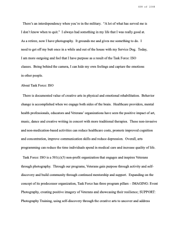 Task Force: ISO is a 501(c)(3) non-profit organization that engages and inspires Veterans through photography. Through our programs, Veterans gain purpose through activity and self- discovery and build community through continued mentorship and support. Expanding on the concept of its predecessor organization, Task Force has three program pillars – IMAGING: Event Photography, creating positive imagery of Veterans and showcasing their resilience; SUPPORT: Photography Training, using self-discovery through the creative arts to uncover and address