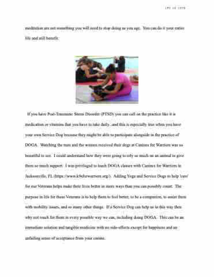 If you have Post-Traumatic Stress Disorder (PTSD) you can call on the practice like it is medication or vitamins that you have to take daily...and this is especially true when you have your own Service Dog because they might be able to participate alongside in the practice of DOGA. Watching the men and the women received their dogs at Canines for Warriors was so beautiful to see. I could understand how they were going to rely so much on an animal to give them so much support. I was privileged to teach DOGA classes with Canines for Warriors in Jacksonville, FL (https://www.k9sforwarriors.org/). Adding Yoga and Service Dogs to help 'care' for our Veterans helps make their lives better in more ways than you can possibly count. The purpose in life for these Veterans is to help them to feel better, to be a companion, to assist them with mobility issues, and so many other things. If a Service Dog can help us in this way then why not reach for them in every possible way we can, including doing DOGA. This can be an immediate solution and tangible medicine with no side-effects except for happiness and an unfailing sense of acceptance from your canine.