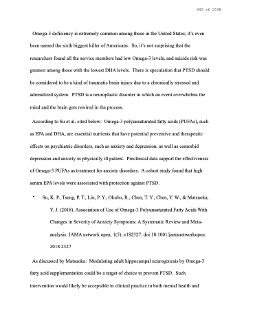 According to Su et al. cited below: Omega-3 polyunsaturated fatty acids (PUFAs), such as EPA and DHA, are essential nutrients that have potential preventive and therapeutic effects on psychiatric disorders, such as anxiety and depression, as well as comorbid depression and anxiety in physically ill patient. Preclinical data support the effectiveness of Omega-3 PUFAs as treatment for anxiety disorders. A cohort study found that high serum EPA levels were associated with protection against PTSD.