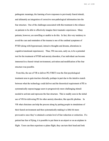 pathogenic meanings, the learning of new responses to previously feared stimuli, and ultimately an integration of corrective non-pathological information into the fear structure. One of the challenges associated with this treatment is the reliance on patients to be able to effectively imagine their traumatic experiences. Many patients, however, are unwilling or unable to do this. In fact, this very tendency to avoid the cues and reminders of the trauma is one of the cardinal symptoms of PTSD (along with hyperarousal, intrusive thoughts and dreams, alterations in cognitive/emotional experiences). Thus, VR was seen, early on, to be a potential tool for the treatment of PTSD and anxiety disorders; if an individual can become immersed in a feared virtual environment, activation and modification of the fear structure was possible.
