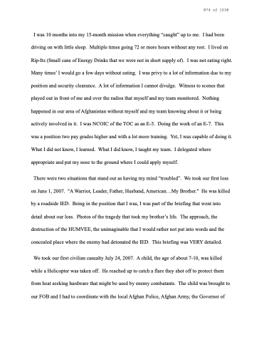 I was 10 months into my 15-month mission when everything “caught” up to me. I had been driving on with little sleep. Multiple times going 72 or more hours without any rest. I lived on Rip-Its (Small cans of Energy Drinks that we were not in short supply of). I was not eating right. Many times’ I would go a few days without eating. I was privy to a lot of information due to my position and security clearance. A lot of information I cannot divulge. Witness to scenes that played out in front of me and over the radios that myself and my team monitored. Nothing happened in our area of Afghanistan without myself and my team knowing about it or being actively involved in it. I was NCOIC of the TOC as an E-5. Doing the work of an E-7. This was a position two pay grades higher and with a lot more training. Yet, I was capable of doing it. What I did not know, I learned. What I did know, I taught my team. I delegated where appropriate and put my nose to the ground where I could apply myself.