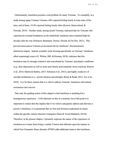 That said, the guiding notion of this chapter is that loneliness is anything but a homogeneous experience. I will elaborate on this in a moment, but at this point it is important to realize that this implies that if we wish to adequately address and alleviate a person’s loneliness, it is paramount that we first and foremost understand its nature within the specific context wherein it transpires (Stein & Tuval-Mashiach, 2015b). Therefore, in the present chapter, I primarily explicate the nature of the experience of loneliness as it stems from being a combat Veteran and elaborate upon the manner in which Post-Traumatic Stress disorder (PTSD) adds additional strata to this loneliness,