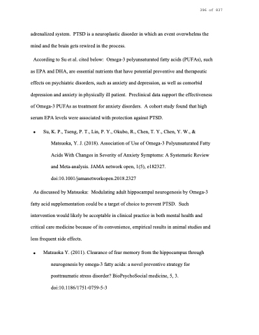 According to Su et al. cited below: Omega-3 polyunsaturated fatty acids (PUFAs), such as EPA and DHA, are essential nutrients that have potential preventive and therapeutic effects on psychiatric disorders, such as anxiety and depression, as well as comorbid depression and anxiety in physically ill patient. Preclinical data support the effectiveness of Omega-3 PUFAs as treatment for anxiety disorders. A cohort study found that high serum EPA levels were associated with protection against PTSD.