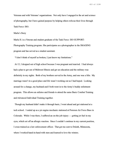 Veterans and with Veterans’ organizations. Not only have I engaged in the art and science of photography, but I have gained purpose by helping others refocus their lives through Task Force: ISO.