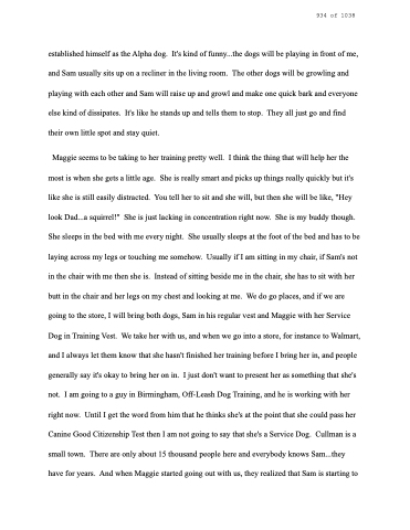 Maggie seems to be taking to her training pretty well. I think the thing that will help her the most is when she gets a little age. She is really smart and picks up things really quickly but it's like she is still easily distracted. You tell her to sit and she will, but then she will be like, "Hey look Dad...a squirrel!" She is just lacking in concentration right now. She is my buddy though. She sleeps in the bed with me every night. She usually sleeps at the foot of the bed and has to be laying across my legs or touching me somehow. Usually if I am sitting in my chair, if Sam's not in the chair with me then she is. Instead of sitting beside me in the chair, she has to sit with her butt in the chair and her legs on my chest and looking at me. We do go places, and if we are going to the store, I will bring both dogs, Sam in his regular vest and Maggie with her Service Dog in Training Vest. We take her with us, and when we go into a store, for instance to Walmart, and I always let them know that she hasn't finished her training before I bring her in, and people generally say it's okay to bring her on in. I just don't want to present her as something that she's not. I am going to a guy in Birmingham, Off-Leash Dog Training, and he is working with her right now. Until I get the word from him that he thinks she's at the point that she could pass her Canine Good Citizenship Test then I am not going to say that she's a Service Dog. Cullman is a small town. There are only about 15 thousand people here and everybody knows Sam...they have for years. And when Maggie started going out with us, they realized that Sam is starting to