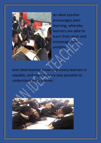 an ideal teacher encourages peer learning, whereby learners are able to learn from each and encourage one another. and ideal teacher know that every learners is capable, and exploit every way possible to understand each learner.