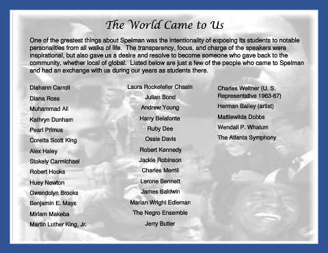 community, whether local of global. Listed below are just a few of the people who came to Spelman