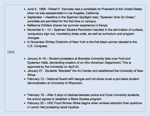 • November 6 – 13 – Spelman Student Revolution resulted in the elimination of curfews,