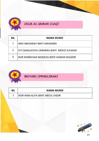 27 CELIK AL-QURAN (CAQ) BIL NAMA MURID 1 ANIS MAISARAH BINTI MAWARDI 2 SITI QHALEESSYA UMAIRAH BINTI MOHD SUHAIMI 3 NUR MARDHIAH NAZEEHA BINTI AHMAD NASZERI BESTARI (PEMULIHAN) BIL NAMA MURID 1 NOR HANI ALIYA BINTI ABDUL KADIR 27
