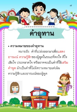 ๗ ค ำอุทำน • ควำมหมำยของค ำอุทำน หมายถึง ค าที่เปล่งออกมาเพื่อแสดง อารมณ์ ความรู้สึกของผู้พูดในขณะที่ตกใจ ดีใจ เสียใจ ประหลาดใจ หรืออาจจะเป็นค าที่ใช้เสริม ค าพูด มักเป็นค าที่ไม่มีความหมายแต่เน้น ความรู้สึกและอารมณ์ของผู้พูด
