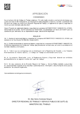 Art. 1.- Aprobar el reglamento higiene y seguridad de la empresa AUTOMOTORES Y ANEXOS S.A. AYASA; con