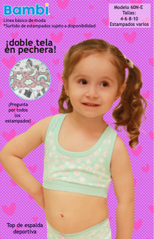 Línea básico de moda *Surtido de estampados sujeto a disponibilidad ¡doble tela en pechera! ¡Pregunta por todos los estampados! Top de espalda deportiva Modelo 60N-E Tallas: 4-6-8-10 Estampados varios