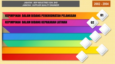 JABATAN : MSP INDUSTRIES SDN. BHD 2002 - 2004 JAWATAN : SUPPLIER QUALITY ENGINEER KEPIMPINAN DALAM BIDANG PERKHIDMATAN PELANGGAN 01 KEPIMPINAN DALAM BIDANG KEPAKARAN LATIHAN 02