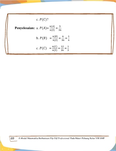 c. ( )? 5 Penyelesaian : a. ( )= ( ) = ( ) 36 ( ) 6 1 b. ( ) = = = ( ) 36 6 ( ) 12 1 c. ( ) = = = ( ) 36 3 69 E-Modul Matematika Berbantuan Flip Pdf Professional Pada Materi Peluang Kelas VIII SMP