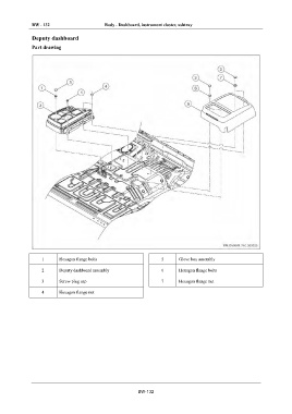 BW - 132 Body - Dashboard, instrument cluster, ashtray Deputy dashboard Part drawing 1 Hexagon flange bolts 5 Glove box assembly 2 Deputy dashboard assembly 6 Hexagon flange bolts 3 Screw plug cap 7 Hexagon flange nut 4 Hexagon flange nut BW-132