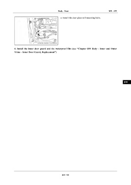 Body - Door BW - 155 e. Install the door glass rail mounting bolts. IN DI EG TR 4. Install the inner door guard and the waterproof film (see “Chapter BW Body - Inner and Outer AX Trims – Inner Door Guard, Replacement”) FR ST BR BW EL BW-155