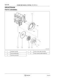 12C-172 ENGINE MECHANICAL SYSTEM - DRIVETRAIN DRIVETRAIN PARTS DRAWING 1 2 3 4 5 fuwx12C455 1 Flywheel housing 4 Clutch driven plate assembly 2 Crankshaft bearing 5 Clutch pressure plate assembly 3 Flywheel assembly Page 612