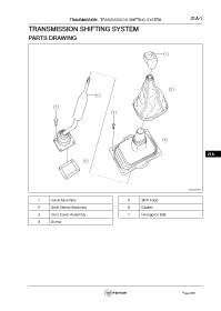 TRANSMISSION - TRANSMISSION SHIFTING SYSTEM 21A-1 TRANSMISSION SHIFTING SYSTEM PARTS DRAWING 21A 1 Knob Assembly 5 Shift Knob 2 Shift Sleeve Assembly 6 Gasket 3 Dust Cover Assembly 7 Hexagonal Bolt 4 Screw Page 843