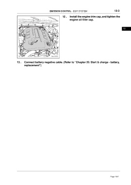 EMISSION CONTROL - EGR SYSTEM 13-3 12 . Install the engine trim cap, and tighten the engine oil filler cap. 13 13 . Connect battery negative cable. (Refer to "Chapter 20. Start & charge - battery, replacement") Page 1347