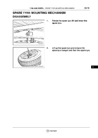 TYRE AND WHEEL - SPARE TYRE MOUNTING MECHANISM 33-15 SPARE TYRE MOUNTING MECHANISM DISASSEMBLY 1 . Rotate the spare tyre lift and lower the spare tyre. 2 . Lift up the spare tyre and remove the spare tyre hanger and then the spare tyre. 33