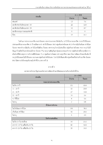 ร้อยละ 58.8 ท างานไม่เกิน 20 วันในหนึ่งเดือน ร้อยละ 68.4 ระบุว่างานไม่ต่อเนื่อง กลุ่มตัวอย่างร้อยละ 96.0 ระบุว่าไม่มี