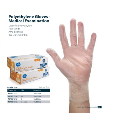 MedPride Powder-Free Polyethylene Examination Gloves are translucent (clear), biocompatible, non-sterile MPR-51513 S 10/300/cs