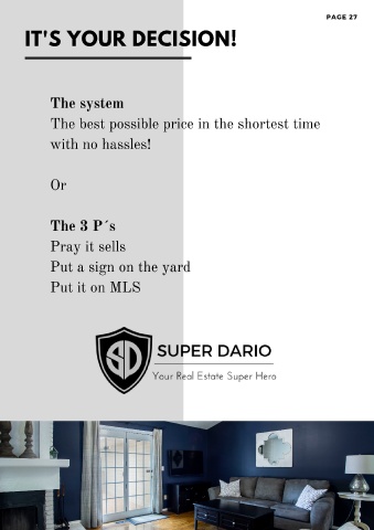 P A G E 2 7 IT'S YOUR DECISION! The system The best possible price in the shortest time with no hassles! Or The 3 P´s Pray it sells Put a sign on the yard Put it on MLS