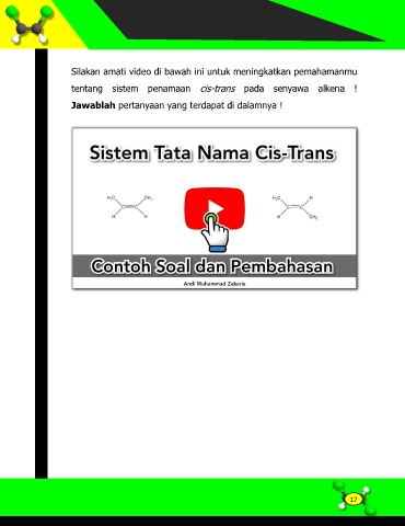 Silakan amati video di bawah ini untuk meningkatkan pemahamanmu tentang sistem penamaan cis-trans pada senyawa alkena ! Jawablah pertanyaan yang terdapat di dalamnya ! 17
