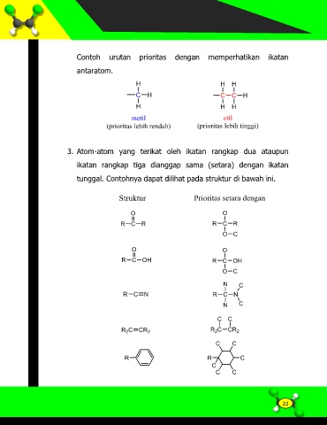 Contoh urutan prioritas dengan memperhatikan ikatan antaratom. 3. Atom-atom yang terikat oleh ikatan rangkap dua ataupun ikatan rangkap tiga dianggap sama (setara) dengan ikatan tunggal. Contohnya dapat dilihat pada struktur di bawah ini. 22