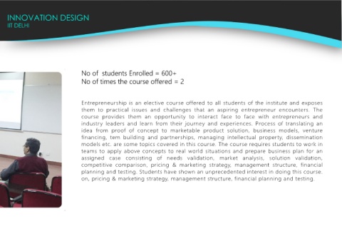 Entrepreneurship is an elective course offered to all students of the institute and exposes