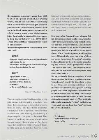 Four years after Freienwill, your bilingual Pol- ish-Lithuanian selection of poems, translat- ed by Birutė Jonuškaitė, was published un- der the title Wolność chmur / Debesų laisvė (Vilnius-Sieradz 2016), which the aforemen- tioned poet and critic Arkadiusz Frania writes about: Maria Duszka’s poems are like splin- ters. Although the vast majority of them are short, they pierce the reader’s sensitive body and fester in their thoughts, stimulat- ing the muscles of the (sub)consciousness. The shorter the texts, the deeper they an- chor, and so, in a beautiful consequence, they instil, they exist (...).