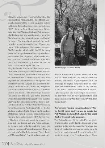 Why did I make this choice? For several years, I had been planning to publish at least some of these translations, scattered in various plac- es, in one volume. I attend international liter- ary festivals and have contact with poets from several countries. English is a universal lan- guage, so thanks to this collection, my poems can reach readers in other countries. Publishing poems and books is like throwing a message in a bottle into the sea – you never know who would find them and what could come out of it. Last year, two situations motivated me to pub- lish this collection. Piotr Spottek interviewed my favourite composer, Andrzej Zarycki, for the Pod Wielkim Dachem Nieba (Under the Great Roof of Heaven) radio program. Spottek then sent him my three collections in PDF. Zarycki real- ly liked the poems and asked for a paper ver- sion. But I no longer had any Polish-Lithuani- an volume, so in order to send it to him, I had to buy a copy myself via online portal. Then, at the last year’s 31st International Poetry Festi- val “Maj nad Wilią”, Stanisław Zawodnik, who