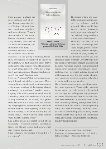 tionships. It’s also poetry of memory, transi- ence, and returns to childhood. In the piece about Małyń, we find a kind of peace that’s perhaps the only possible form of happiness: not much happens here (...) / the sun is smil- ing // there is calmness blueness and green- ness // not much happens here 4
