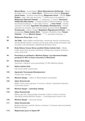 Maciej Mazur – hochsztapler; Marta Mazurkiewicz-Stefańczyk – Miłość, Rozstępy, List do syna; Anna Obara – Wskrzeszony, Wywiad; Katarzyna Osuch Leniec – Studium odrętwienia; Małgorzata Osuch – TEATR; Edyta Rauhut – julia, nikt tego nie powie, *** (iskrzy się pot na poduszce...); Małgorzata Skwarek-Gałęska – 2. zdziwienie, 3. wielość; Sławomira Sobkowska-Marczyńska – Z inspiracji Mirona Białoszewskiego, Na lipę (nie Kochanowskiego), *** (jest takie miejsce...); Irena Tetlak – zmiany ustrojowe człowieka; Agnieszka Tomczyszyn–Harasymowicz – Łatwiej odchodzi się od siebie, gdy wszystko dzieje się przez dotyk; Grzegorz Trochimczuk – Podróż, Ludiek; Magdalena Węgrzynowicz-Plichta – (De) kompres(ja); Kalina Izabela Zioła – Czekanie, Świetlista cisza; Tomasz Zubiński – Drzwi; Marlena Zynger – *** (1. przedświt Andrzeju...)