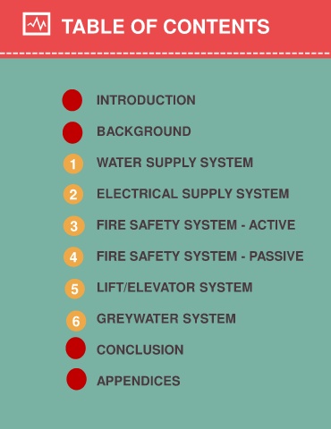 TABLE OF CONTENTS INTRODUCTION BACKGROUND 1 WATER SUPPLY SYSTEM 2 ELECTRICAL SUPPLY SYSTEM 3 FIRE SAFETY SYSTEM - ACTIVE 4 FIRE SAFETY SYSTEM - PASSIVE 5 LIFT/ELEVATOR SYSTEM 6 GREYWATER SYSTEM CONCLUSION APPENDICES