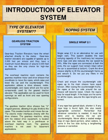 Gear-less Traction Elevators have the wheel Single wrap 2:1 is an alternative for use with