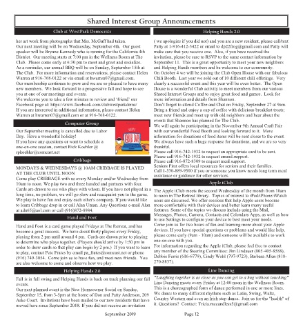 Facebook page at: https://www.facebook.com/clubwestparkdems/ Don’t forget to attend Coffee and Chat on Friday, September 27 at 9am.