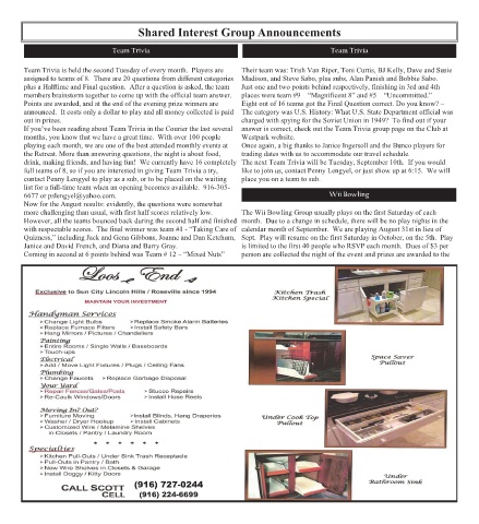 full teams of 8, so if you are interested in giving Team Trivia a try, like to join us, contact Penny Lengyel, or just show up at 6:15. We will